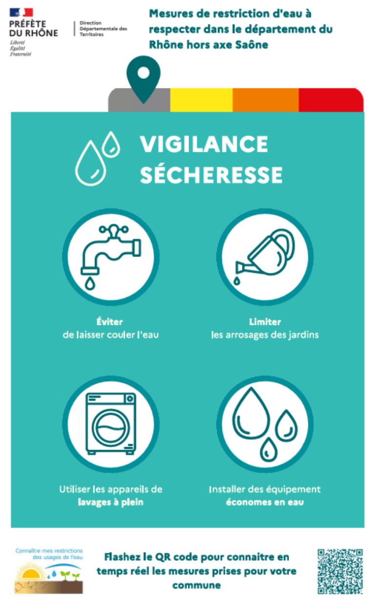 Les usagers peuvent s’informer des mesures de restrictions en vigueur sur leur commune, selon la situation du moment, en consultant la plateforme en ligne VigiEau : https://vigieau.gouv.fr/