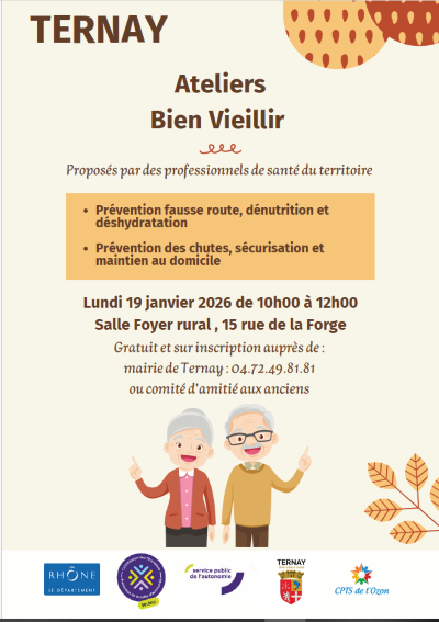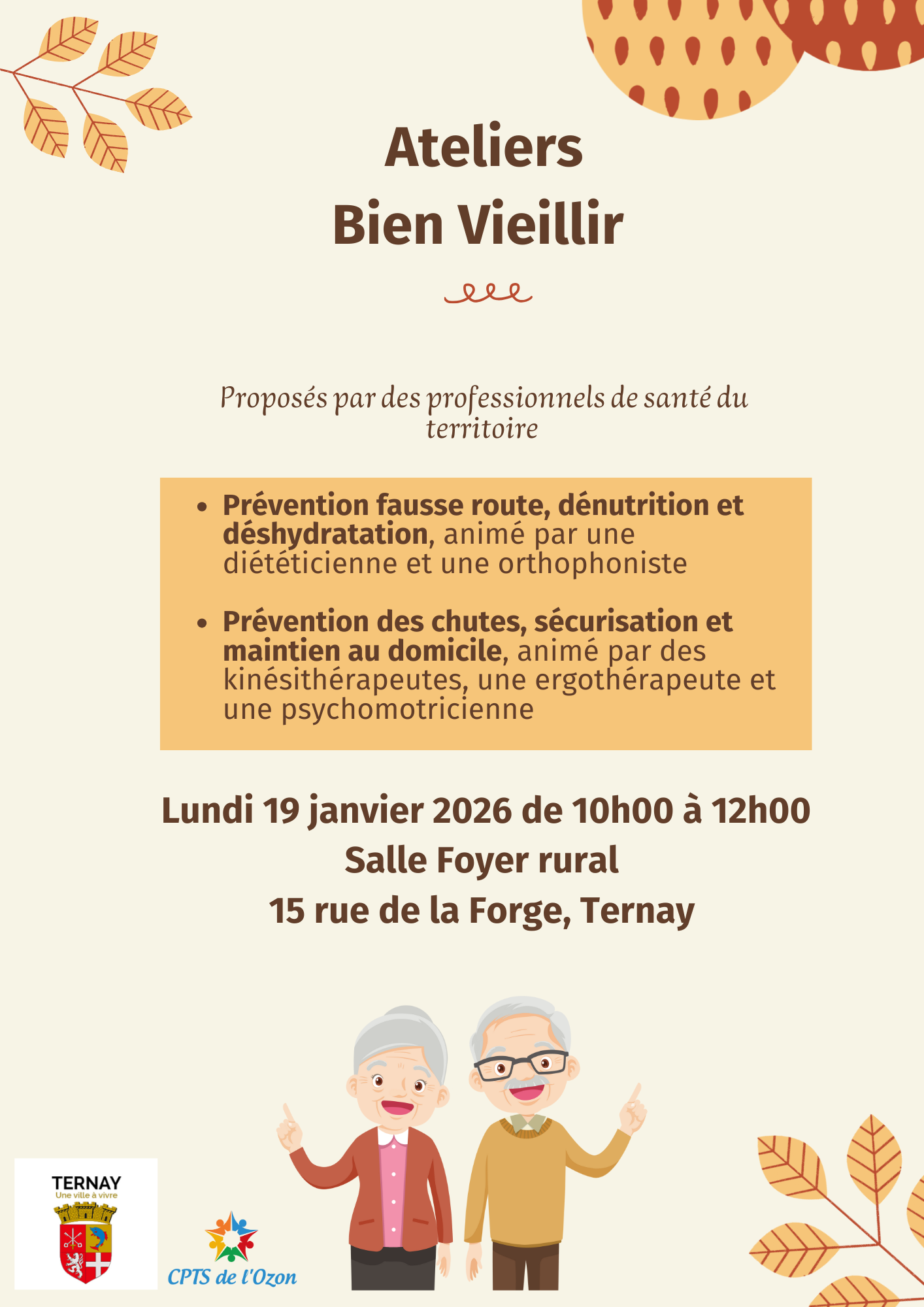 Accueil Agenda Agenda Ateliers Bien Vieillir Ateliers Bien Vieillir Prévention. Le lundi 19 janvier 2026 Horaires De 10h00 à 12h00 Localisation Foyer Rural Agenda Télécharger en PDF Imprimer Partager ✓ Lien copié Précédent Retour à l'Agenda